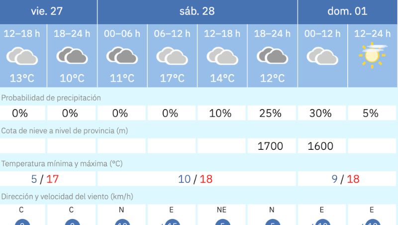 La jornada del viernes estará dominada por cielos muy nubosos, sin riesgo de precipitaciones. Las temperaturas oscilarán entre los 5 °C y 17 °C, acompañadas de viento muy débil o en calma, lo que dejará un día tranquilo y sin sobresaltos. Pese a la falta de sol, la sensación térmica será suave y agradable.