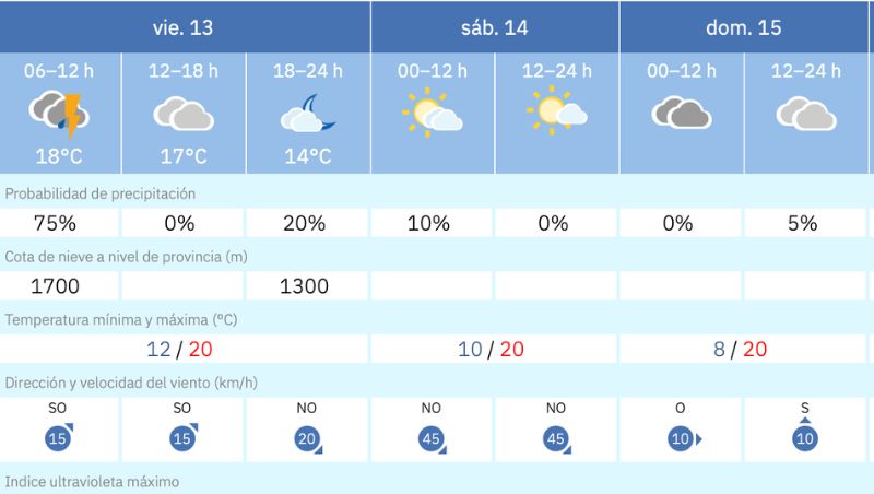 El domingo se espera una clara mejoría. No hay avisos meteorológicos relevantes y el viento disminuirá de forma notable, con velocidades que rondarán los 10 a 20 km/h. El cielo permanecerá nuboso o parcialmente cubierto y las temperaturas se situarán entre los 8 y los 20 grados.