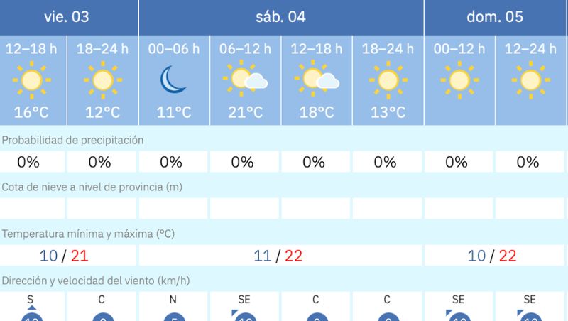 El sábado mantendrá la misma línea de estabilidad. Las temperaturas ascenderán ligeramente, con máximas de 22 °C y mínimas de 11 °C, y el cielo se mantendrá despejado durante toda la jornada.